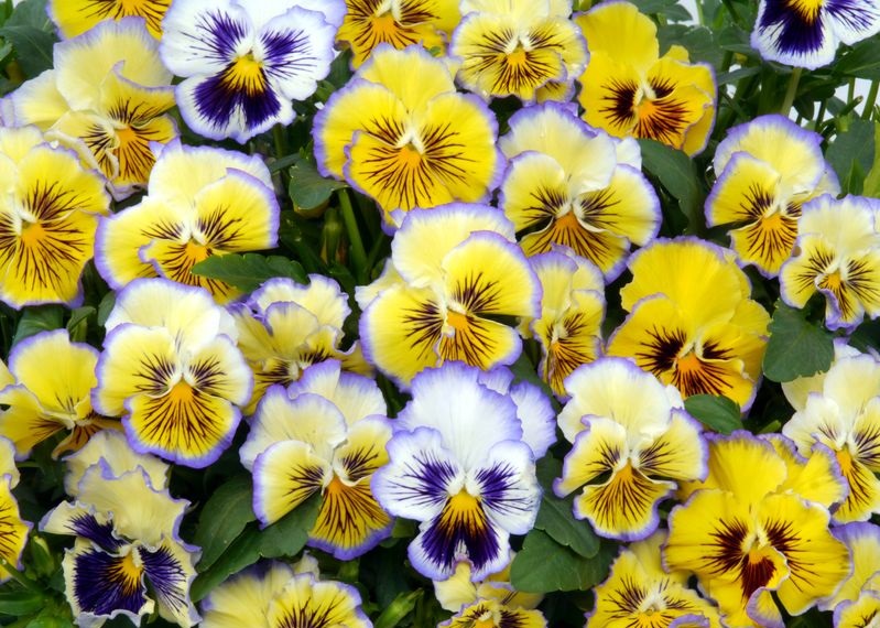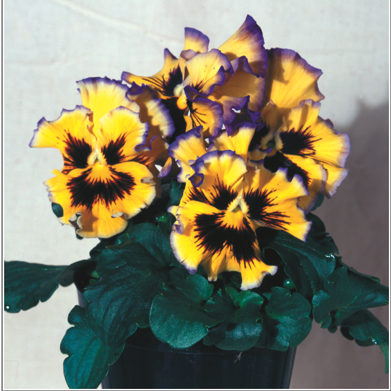 Гибридная виола серии Aurora характеризуется  яркой контрастной окраской  пикоти: желтые цветки с голубой каймой. Растения крепкие, компактные