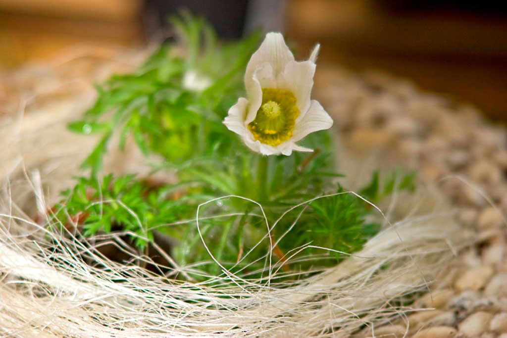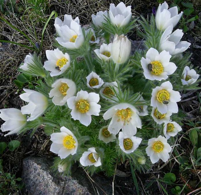 Сорт серии `Pinwheel`. Стебли прямостоячие, волосистые, высотой до 30 см. Листья перистые зеленые с серебристым, опушением, собраны в розетку. Цветки распускаются одновременно с появлением листьев. Они крупные (диаметром около 5 см), голубовато-фиолетовые с ярко-жёлтыми тычинками. Листочки околоцветника снаружи густо покрыты волосками. После цветения образуются пушистые семенные головки. Цветет в апреле. Зимостоек.