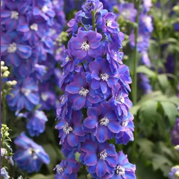 Этот дельфиниум представляет собой мощный среднерослый кустарник. Его высота составляет примерно 75-100 сантиметров. Побеги прямостоячие и устойчивые. Цветоносы на кустах достаточно прочные, плотные и крупные. Диаметр цветка в среднем равен 8 сантиметрам. Их расцветка переливчато сине-фиолетовая. Сорт Гардиан Блю также относится к махровым видам. Цветет растение дважды в сезон. Первый период цветения приходится на июнь-июль. Второе цветение происходит в начале осени.
